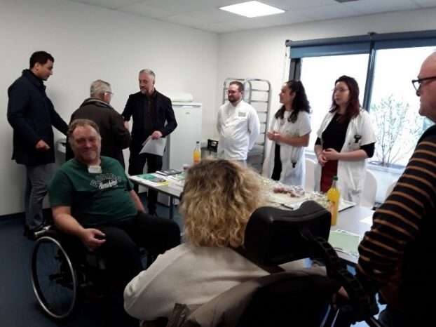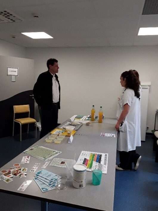 Dans un couloir perpendiculaire, se trouvaient les deux orthophonistes ainsi que l’équipe de restauration, avec un cuisinier et la diététicienne, pour vous faire découvrir la qualité des repas, en texture mixée, ainsi que leurs missions respectives. En effet, nous avons la chance d’avoir un service de restauration qui assure la préparation des repas sur place, avec une adaptation des textures pour les entrées et les desserts. Les orthophonistes ont également pu présenter l’étendue de leur champ de compétences, parfois méconnu (troubles phasiques, cognitifs, phonatoires…).